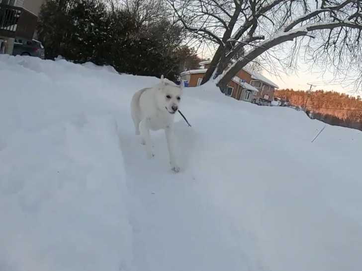 Ce Labsky au pelage blanc court après son maître avec un bâton dans la bouche. Le ralenti permet d'observer les mouvements de ce Labsky plus en détail. Issu du croisement entre le Labrador et le Husky, le Labsky est un chien très attachant et joyeux. Il se faufile habilement et à toute vitesse à travers la neige.