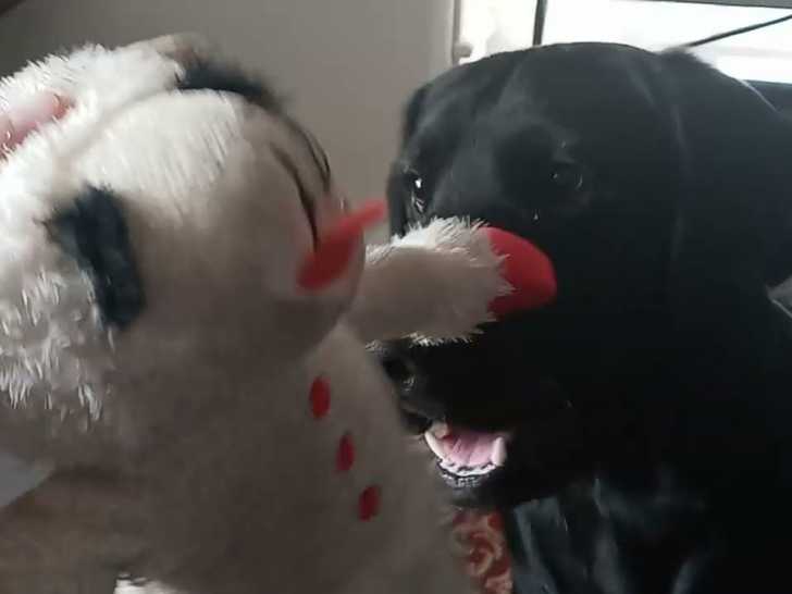 Ce chien Goldador au pelage noir est assis devant son maître. Ce dernier lui montre une peluche qu'il lance à l'autre bout de la pièce. Le Goldador part immédiatement la chercher avant de s'allonger avec dans son panier. Issu du croisement entre le Golden Retriever et le Labrador Retriever, le Goldador est un chien sensible et doux.