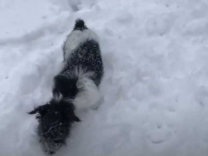 Ce Jack-A-Poo sort jouer dans la neige fraîchement tombée pour la première fois. Les flocons se sont accumulés, créant une épaisseur parfaite pour qu'il puisse bondir et courir. Il s'amuse avec ses compagnons et creuse avec ses pattes dans la neige. Le Jack-A-Poo est issu du croisement entre le Jack Russell et le Caniche.