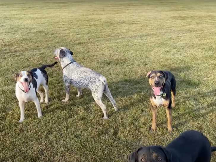 Ces cinq chiens Catahoula Heeler se promènent avec leur maître en cette journée d'été très ensoleillée. Il fait très chaud, ce qui donne très soif à tous les chiens. Issu du croisement entre le Chien Léopard Catahoula et le Bouvier Australien (Heeler), le Catahoula Heeler est le parfait compagnon pour une famille, qu'elle ait des enfants ou non.