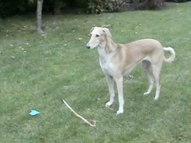 Un Chart Polski s'amuse en plein-air, avec un simple bâton en bois. Il le mord, court avec, etc.