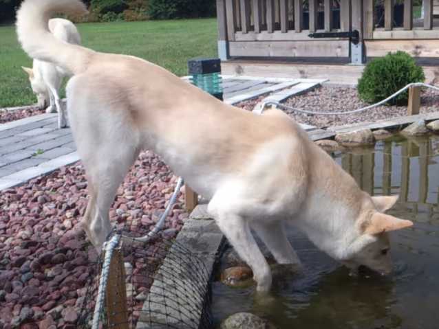 Ce Chien de Canaan est intéressé par ce qui se trouve dans ce bassin d'eau. Malgré les barrières érigées autour de la mare, le chien renifle et met son museau dans l'eau.