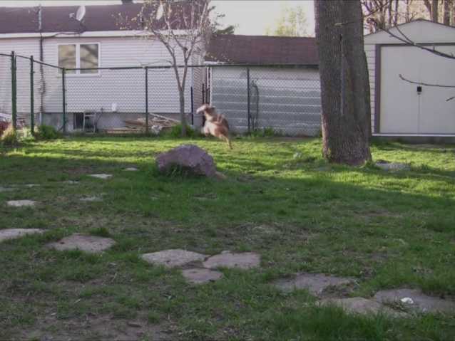 Pokey est à l'affût face à son maître. Il attend impatiemment que celui-ci envoi le frisbee... Une fois lancé vers le fond du jardin, le fougueux Terrier virevolte et court assez rapidement pour attraper le frisbee avant qu'il ne retombe.