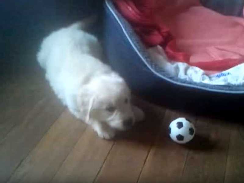 Cet adorable chiot Golden Retriever joue avec son ballon mais il en a peur. Une situation quelque peu surprenante. Ce chiot réussira-t-il à dépasser ses peurs pour jouer sereinement avec son ballon ?