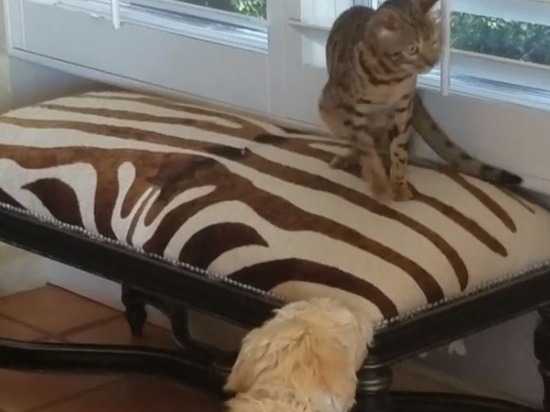 C’est au sein d'un vaste appartement qu'un Goldendoodle et un Bengal s’amusent tels des petits fous. Au début, le chat n’est pas très enthousiaste et le chiot aboie à plusieurs reprises afin de l'inciter à jouer. Puis, le félin se prend au jeu et le jeune chien va devoir faire face aux coups de patte amicaux de son compagnon.