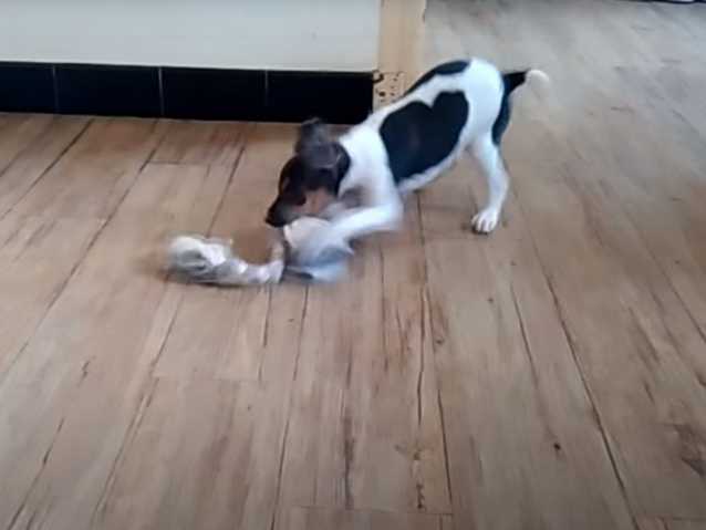 Voici un chiot Terrier Brésilien qui s’amuse comme un fou avec des jouets pour chien. Il les attrape en pleine gueule et ne les lâche plus, tournant autour de lui-même dans une folle agitation.