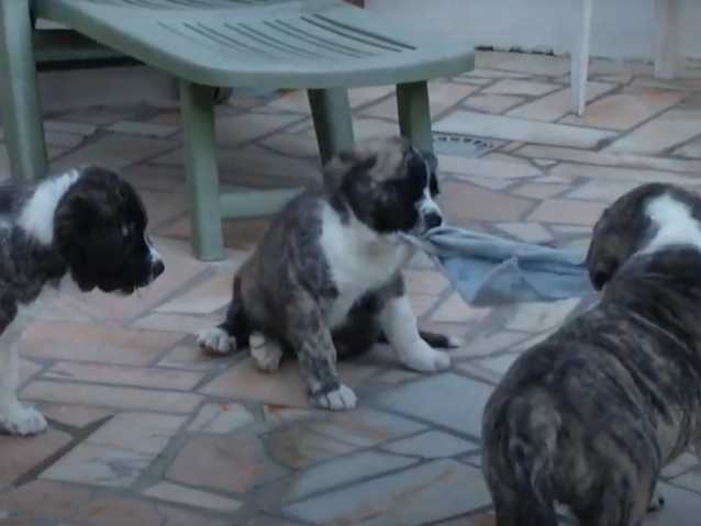 Bien installés sur la terrasse de la maison familiale, voici des chiots Raferio do Alentejo qui s’amusent comme des petits fous entre eux. En présence d'un chat et d'un congénère adulte, ils s’adonnent à toutes sortes de jeux. Les petits molosses profitent également d'une gamelle remplie de savoureuses croquettes.