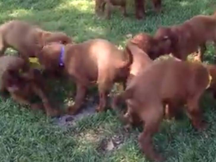 Voici le jeu du tir à la corde revisité par cette portée de chiots Setter irlandais. Sous l'œil vigilant de leur maman, ces petits se défoulent en tirant à qui mieux-mieux sur la branche qu'ils ont trouvé. Et en juste récompense de leurs efforts, maman les attend pour leur donner la tétée.