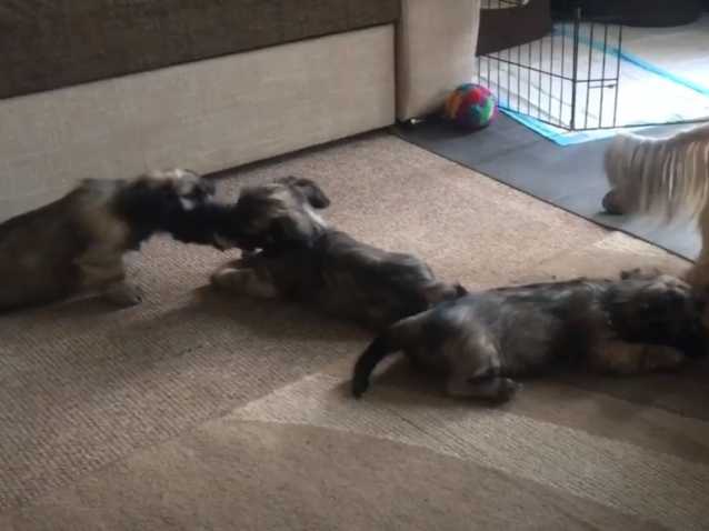 Bien installés sur le tapis du salon, des chiots Skye Terriers s’amusent entre eux et surtout avec tout ce qui leur tombe sous la truffe, la pièce étant remplie de jouets pour chien.