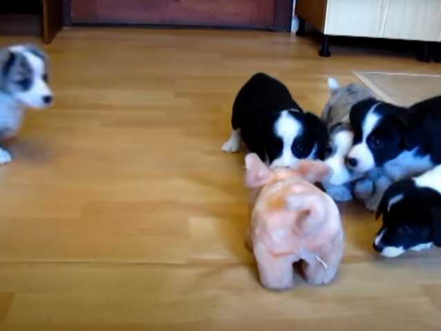 Voici des chiots Welsh Corgi Cardigan qui se trouvent confrontés à un cochon. Ce petit animal en peluche a beau faire office de jouet pour chien, il se déplace tout seul et fait un sacré bruit.
