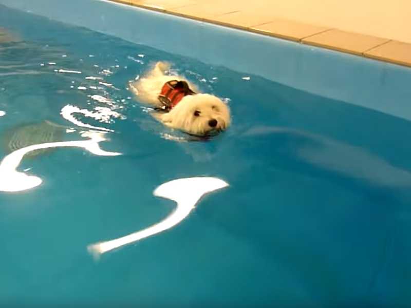 Nanna, une Coton de Tuléar, adore nager et en plus elle le fait très bien. Aujourd'hui c'est dans une piscine qu'elle nage, en suivant sa maîtresse qui la guide en lui montrant le trajet à effectuer. Une chose est sûre : malgré ses toutes petites pattes, ce Coton de Tuléar nage vraiment très bien.