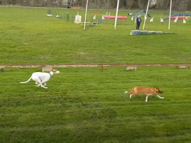 Sur le gazon bien tondu d'une piste de course, voici un Lévrier des Canaries et un Podenco d'Ibiza qui s'affrontent. Ils présentent un gabarit et une corpulence similaires et leur poids est relativement proche.