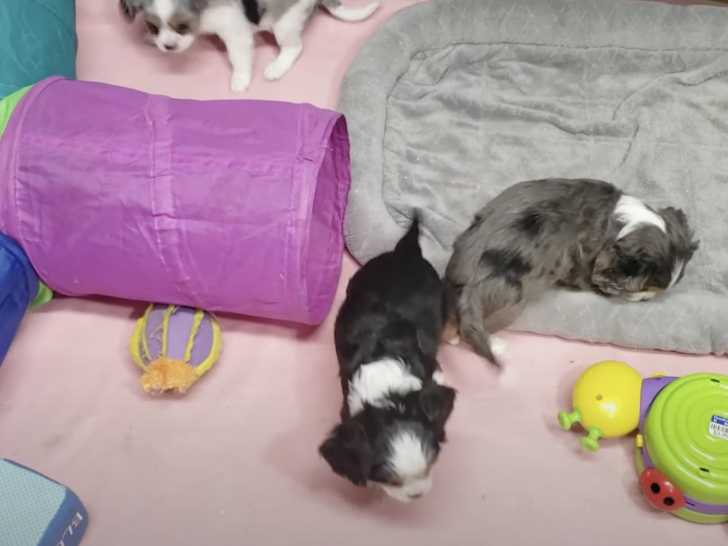 Dans l'espace qui leur est dédié, ces petits Aussaliers jouent ensemble. Ils explorent de petits tunnels et s'amusent avec des peluches et d'autres jouets, car l'Aussalier, qui est issu du croisement entre le Cavalier King Charles Spaniel et le Berger Australien, est très joueur. Pleins d'énergie, ils cherchent les caresses de leur maître en remuant la queue.