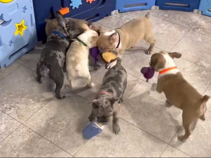 Ces adorables petits Faux Frenchbo Bulldog s'amusent dans leur enclos, entourés de peluches et de jouets colorés choisis par leurs propriétaires. Ils attendent tous avec impatience de trouver une famille aimante qui les adoptera. Le Faux Frenchbo Bulldog est le fruit du croisement entre le Bouledogue Français et le Boston Terrier.