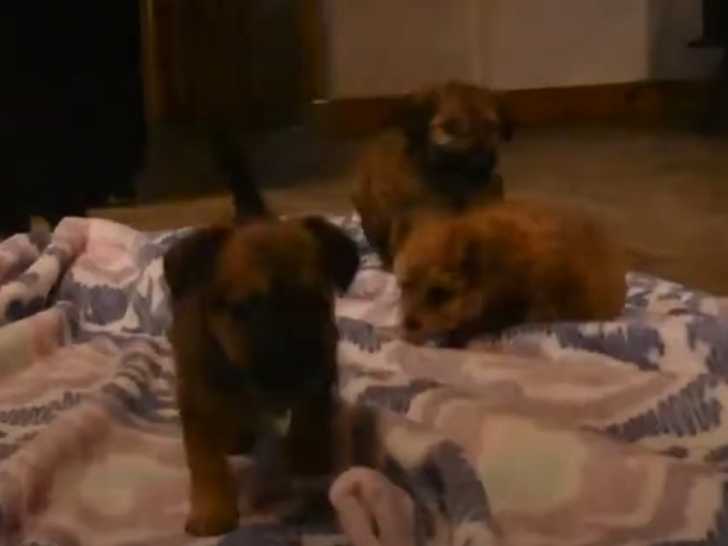 Cette vidéo montre de très jeunes chiens Chi-Poo qui sont en train de jouer. Positionnés au milieu d'une pièce, ils s'amusent avec une couverture posée au sol. Tandis que certains la mordillent avec intérêt, d'autres sont stimulés par quelqu'un qui court près d'eux. Ils semblent être éveillés et complices : la cohabitation entre les chiots a l'air de fonctionner.