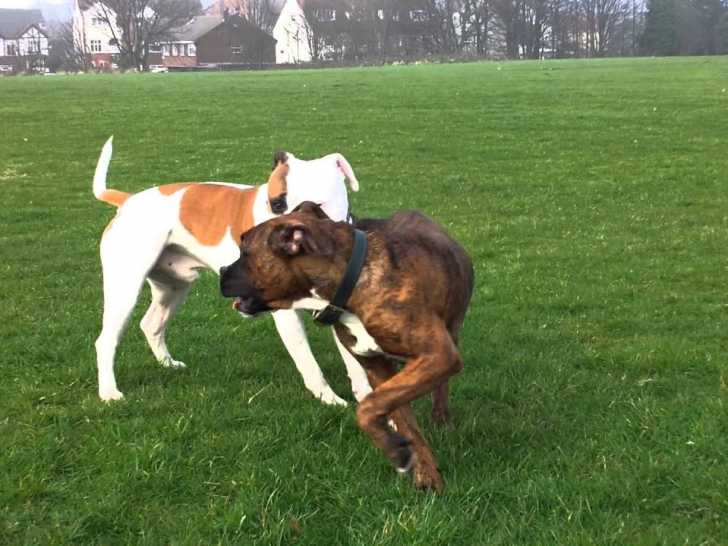 Ces deux chiens Bullboxer sont remplis d'énergie et ont besoin de sortir pour se dégourdir les pattes. Pour cela, leur maître les emmène dans un grand espace vert où ils peuvent courir et s'amuser comme bon leur semble. Résultat du croisement entre le Bouledogue Anglais et le Boxer, le Bullboxer est un chien énergique, mais aussi très intelligent.