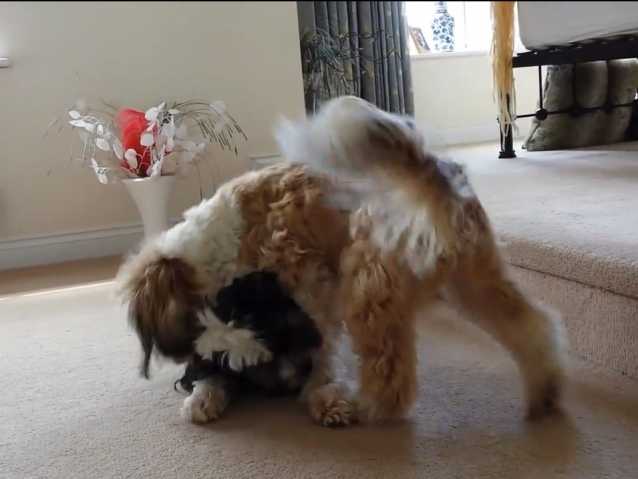 Le Terrier du Tibet est un chien particulièrement sociable, qui apprécie autant les interactions avec son maître que les moments de jeu avec d’autres chiens. On peut observer ici deux individus de cette race engagés dans une partie de jeu très dynamique, au cours de laquelle ils se livrent à des affrontements amicaux. Leur vivacité et leur enthousiasme illustrent bien le tempérament joueur, expressif et affectueux de ces chiens, qui ont besoin de stimulation et de contacts réguliers pour s’épanouir pleinement.