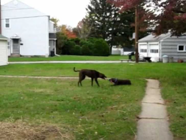 Ces deux Weimapeake, nommés Porter et Lilly, jouent dans le jardin en courant à toute vitesse. Ils s'amusent également avec une corde, chacun tenant un bout et tirant le plus fort possible. Le Weimapeake, issu du croisement entre le Chesapeake Bay Retriever et le Braque de Weimar, est un compagnon sportif et énergique, souvent utilisé pour la chasse.