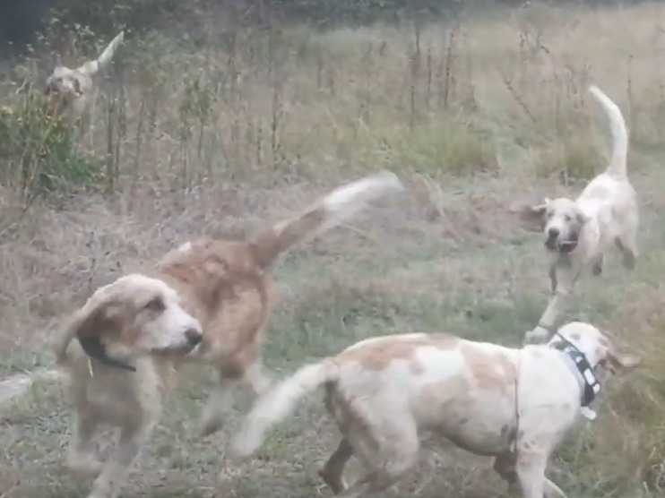 Petite séquence de film dans laquelle on voit quatre Grands Griffons Vendéens courir et s'ébattre ensemble dans un champ. Pour approcher le style de la race.