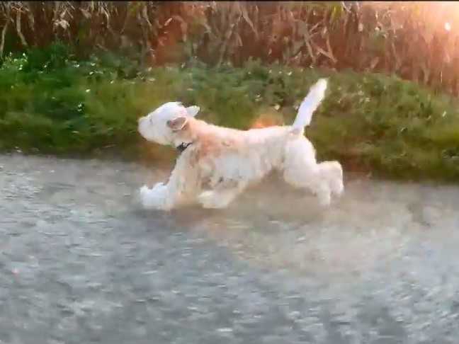 Aragorn, un Irish Soft Coated Wheaten Terrier et sa sœur Antonia, s'amusent en courant à toute vitesse dans des champs. Ces chiens plein d'énergie se dépensent en s'amusant, avant de se rafraichir en trempant leurs pattes dans une petite flaque d'eau boueuse.