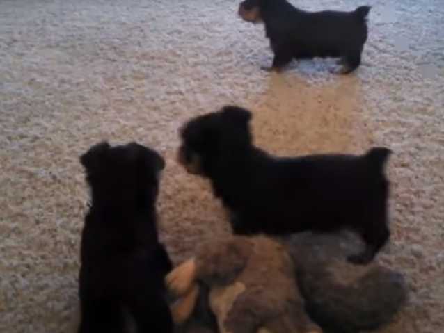 Très à l’aise sur l’épais tapis du salon, voici des chiots Silky Terriers qui s’en donnent à cœur joie. Sous l’œil de leur mère, ils se ruent dessus les uns sur les autres jusqu'à former une grosse boule de poils. Les petits terriers s’en prennent également à l'écureuil en peluche qui leur sert de jouet pour chien.