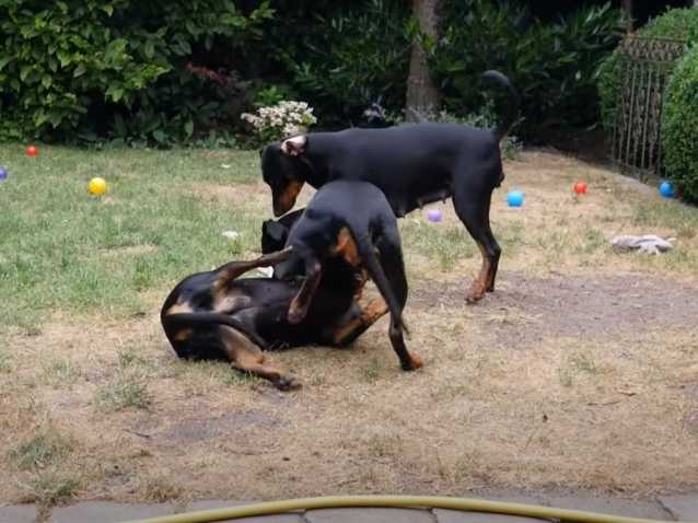 Se sautant dessus les uns sur les autres tout en se mordillant avec malice, ces Pinscher Moyen respirent la joie et la bonne humeur. C'est un beau moment de détente et de complicité !