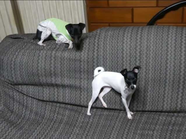 Voici deux Terriers japonais qui ont l’air de bien s’entendre. Ils s’en donnent à cœur joie sur le canapé familial, tels des enfants dans un bac à sable.