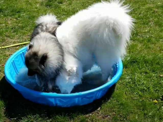 Quoi de mieux en été pour se rafraîchir que de patauger dans une piscine ? Ce Keeshond et ce Samoyède l'ont bien compris : ils se chahutent gentiment pour profiter tour à tour d'une eau bien fraîche.