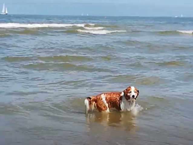 En tant que chien actif, il préfère des vacances sportives plutôt que de rester lézarder sur la plage. Ce Kooikerhondje profite des vagues de la Mer du Nord pour se détendre et s'amuser comme un petit fou.