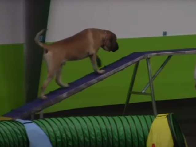 Dans une salle de gymnase remplie de monde, voici un imposant Mastiff qui effectue, avec une démarche nonchalante, un parcours d’agility. Malgré son poids et sa corpulence, le molosse va réaliser chacun des exercices avec une élégante souplesse, passant sous les tunnels et sautant les barrières ou obstacles sous les applaudissements du public enthousiaste.