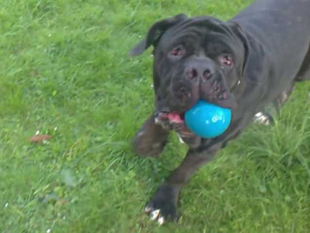 C'est l'heure de la sortie du jour pour Archange, un Mâtin Napolitain de robe noire.