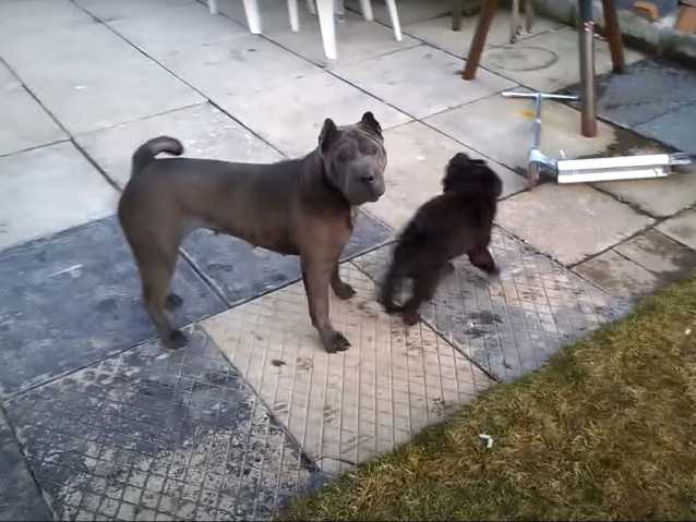 Ayant un physique commun, le Mini Peï et le Sharpeï n'ont pas le même gabarit et la même corpulence puisque le premier est la variété miniature du second. Voici donc ces deux chiens qui s'amusent ensemble dans la cour familiale. Il ne fait aucun doute qu'ils ne font pas semblant dans une telle partie de jeu endiablée.