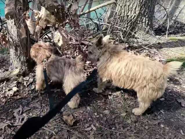 Bien tenus en laisse, voici des Norfolk Terrier qui font une balade automnale dans les bois. C’est sur un long sentier recouvert de feuilles mortes qu’ils vont se promener et croiser des Cairn Terrier et un Pinscher Nain, eux aussi en promenade. Ce couple de Norfolk Terrier apprécie un tel moment de détente à l'extérieur qui permet de réaliser un peu d'exercice physique en pleine nature.