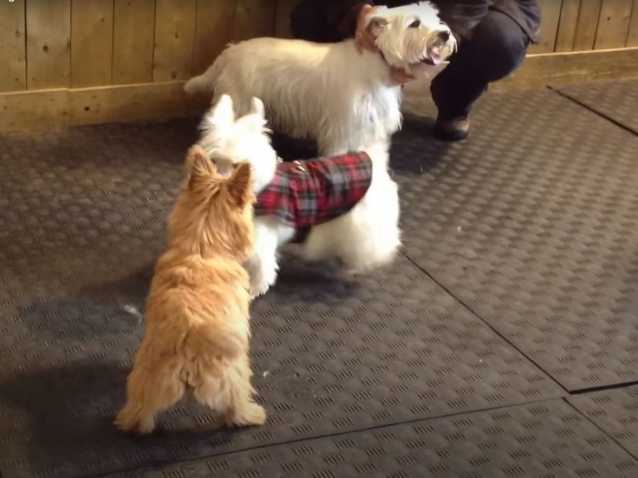 C’est en compagnie d’un petit groupe de Westie qu'un Norwich Terrier s’amuse comme un petit fou. Et vu qu’ils sont à peu près de la même taille et de même corpulence, c’est avec une grande complicité que ces petits chiens jouent tous ensemble au milieu de l'entourage familial venu les observer en grand nombre.
