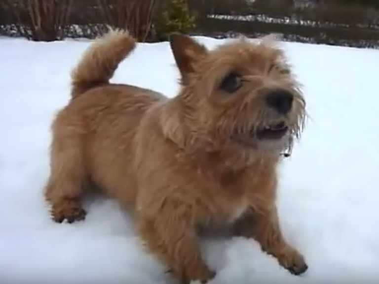 Découvrez Kalle, un petit Norwish Terrier qui s'amuse comme un fou dans la neige. Son maître le touche, ce qui fait directement réagir ce chien très vif qui se met à courir dans la neige avant de revenir devant son maître. Le Norwish Terrier est un chien très joueur et affectueux, idéal avec les enfants.