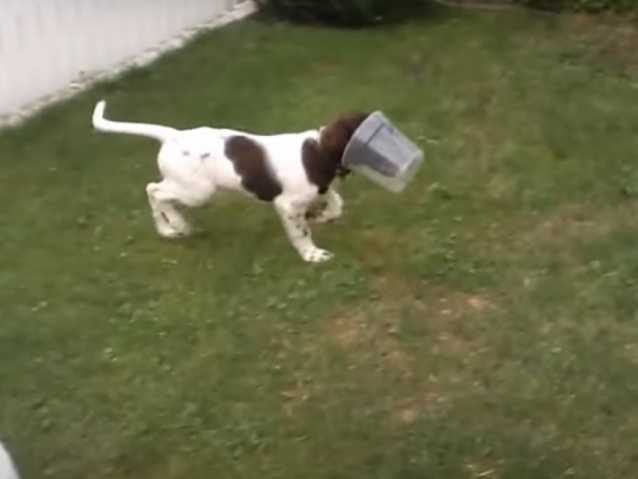 Affublé d'un bocal en plastique sur la gueule en guise de chapeau, un Petit Epagneul de Münster joue dans le jardin familial. Il s'amuse à déplacer le récipient sur tout le terrain, en courant fièrement avec son trophée.