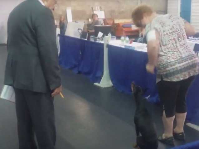 Devant un jury composé de spécialistes canins, voici un Pinscher Allemand qui passe un test d’obéissance. Accompagné de sa maîtresse, il suit les instructions avec grande attention.