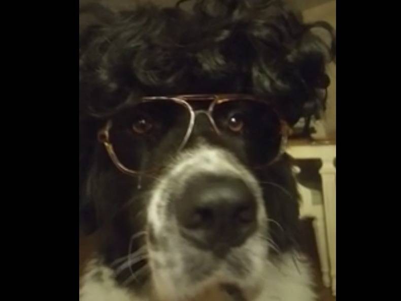Haydes est un Landseer Newfoundland de six ans.Comme il est doux et placide, ses maîtres peuvent facilement jouer avec lui et notamment le déguiser, comme sur cette vidéo. Il ressemble quelque peu à un mafieux des années soixante-dix n'est-ce pas ? A moins que ce ne soit plutôt un remix de Mme Doudtfire ?
