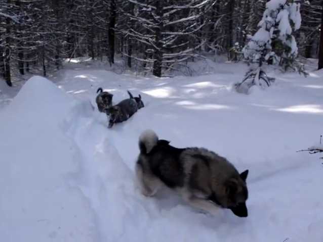 Il fait une belle journée ensoleillée et cette maman Jämthund en profite pour faire une randonnée avec ses 3 chiots.