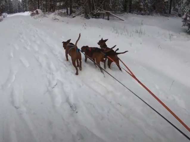 C’est sur un épais manteau de neige recouvrant la piste qu'un groupe de Pinscher Allemands tire un traîneau lors d'une randonnée. Et ces chiens sportifs s’en tirent plutôt bien car il s'agit d'un exercice physique nécessitant de la force et de l'endurance.