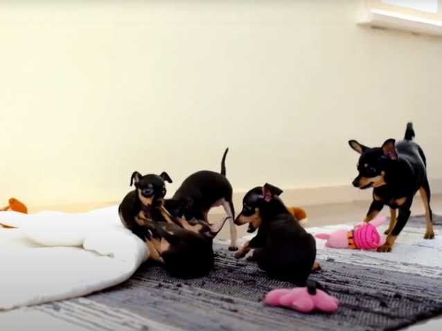 Bien installée sur un tapis qui leur est dédié, voici une famille de Ratiers de Prague qui prend du bon temps. Les petits s'amusent comme des fous avec diverses peluches en guise de jouets pour chien. Même leur mère prend part à cette folle partie de jeu, ce qui stimule encore plus les chiots !