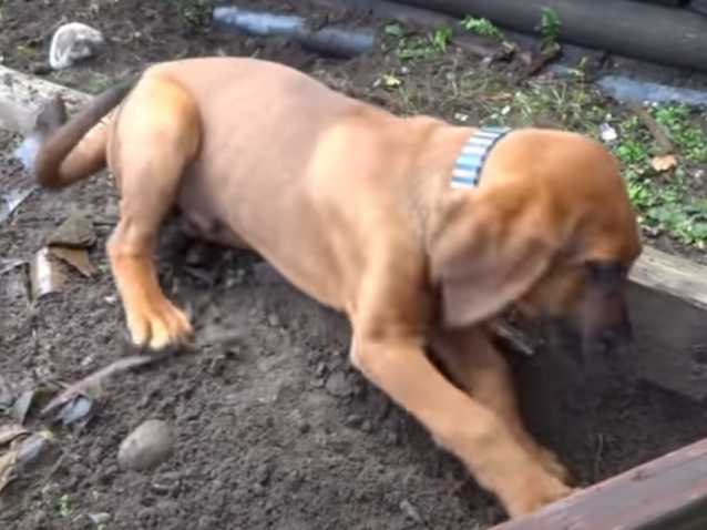Après avoir longuement flairé un petit bout de terre, voici un jeune Redbone Coonhound qui se met à creuser de toutes ses forces. Le chien de chasse y met toute son énergie, la poussière ne le gênant pas. Finalement, il parvient avec obstination à faire un trou conséquent malgré la dureté du sol.