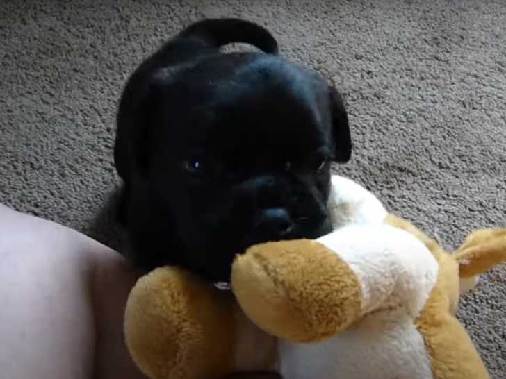 Cette adorable Pucker de 4 semaines prénommée Sallie découvre le monde qui s'offre à elle. Elle court, sautille, mordille et joue avec tout ce qui l'entoure. Mais son jouet préféré reste les jambes de sa maîtresse, même si elle affectionne tout particulièrement sa peluche en forme de renne. Le Pucker est issu du croisement entre le Carlin et le Cocker, tous deux des chiens joueurs.