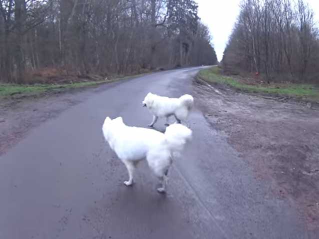 Voici une vidéo qui montre trois Samoyèdes en train de gambader à la campagne. Au cours de leur balade, un autre chien de plus petite taille se joint à eux. Tous ensemble, ils poursuivent leur chemin en s'amusant comme des petits fous !