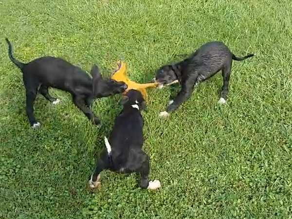 Ces chiots American Staghound d'à peine sept semaines expriment déjà un solide instinct de chasseur en poursuivant longuement un gant. Ils font aussi preuve d'un terrible mordant en refusant de lâcher leur proie et en tentant même de la déchiqueter. Ces petits montrent pourquoi cette race est encore beaucoup utilisée pour la chasse au gros gibier.