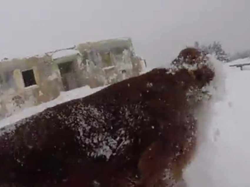 Balade en campagne sous la neige pour Badi, le Setter irlandais. On le voit ravi de passer ce moment en compagnie de son maître, de pouvoir déambuler librement, bondissant pour éviter de trop se mouiller les pattes, et courant après les flocons. Un bon moment de complicité sous l'œil de la caméra.