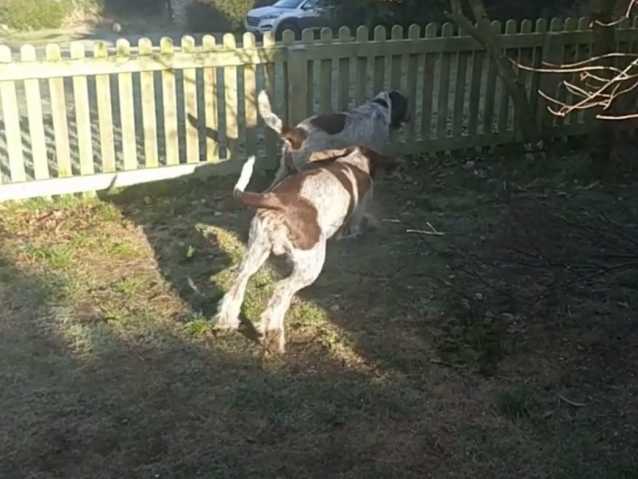 Voici donc deux Spinone Italiano, bien que paraissant un peu âgé, qui s’amusent comme des chiots à se courir après, se tourner autour et se mordiller.