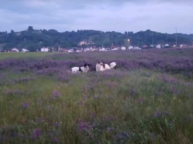 Voici donc un couple de Tornjak qui courent et se poursuivent au beau milieu d'un champ rempli de fleurs. Au cours de cette folle partie de jeu, ils n’hésitent pas à se sauter dessus et à gambader à leur gré. Puis, quelque peu essoufflés après l’effort, ils ralentissent un peu la cadence pour récupérer.
