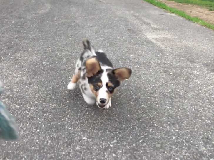 Le propriétaire de cet Aussie-Corgi lui a acheté un nouveau jouet : une corde. Lors d'une balade sur un parking, le maître sort la corde et la tient dans sa main, et son compagnon, qui était au loin, accourt à toute vitesse pour la récupérer. L'Aussie-Corgi est issu du croisement entre le Berger Australien et le Welsh Corgi Pembroke.