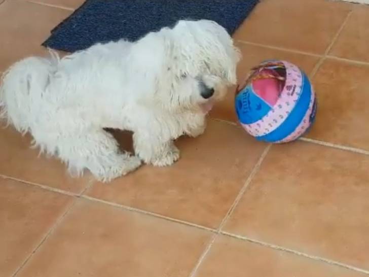 Cette vidéo montre un petit chien blanc de race Bichon Maltais, nommé Obelix, qui joue avec un ballon de plage bleu. Alors que le jouet roule d'un côté et de l'autre de la terrasse, Obelix le suit en courant avec beaucoup d'entraîn. Cette séquence illustre la capacité de ce chien à s'amuser avec une balle sans l'intervention de son propriétaire.